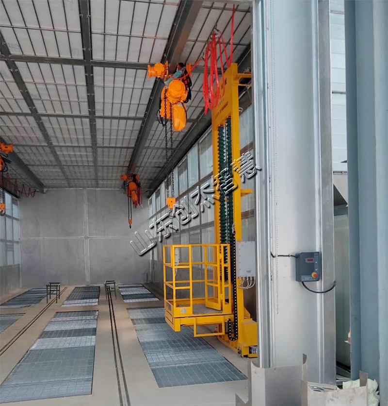 噴漆房II為吊掛式噴漆房,中間不隔斷,兩側配三維升降工作臺,室頂安裝兩根2.5噸電動葫蘆導軌,每根承重能力≥5噸,各配兩個≥2.5噸的環鏈電動葫蘆。