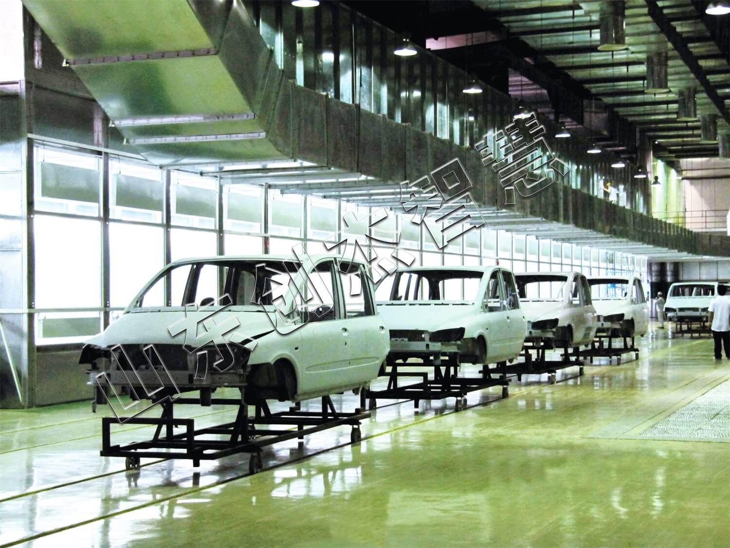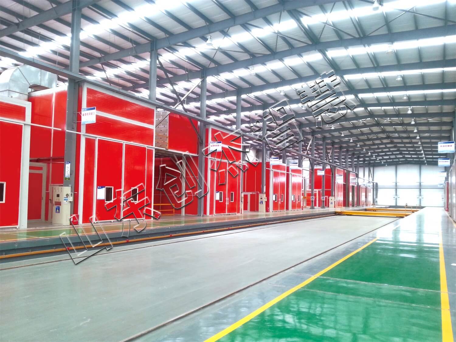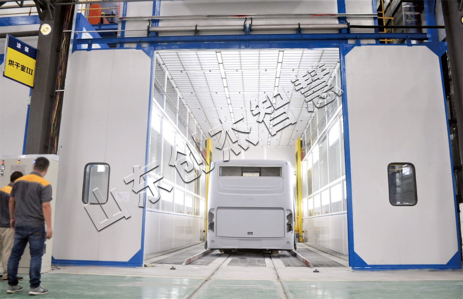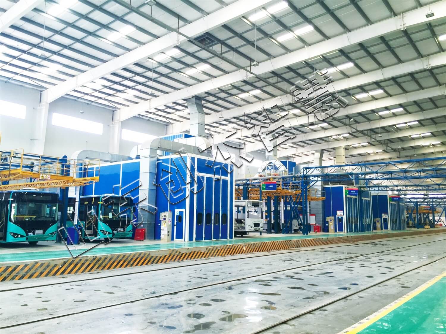 在客車涂裝生產線上,影響涂裝質量的因素很多,噴漆室是客車涂裝過程中非常重要的地方。那么,客車涂裝生產線的噴漆間有什么要求呢?趕緊跟我了解一下! (1)需要設置手動噴淋室、機器人操作室、調平室,一般為三件套設置,中間隔離采用快速升降門。補噴室主要完成對基材磨損部位的無磨損耐腐蝕底漆的補噴,以及機器人無法提前到達的門體及內襯周圍部位的預噴;設置流平室的目的主要是為了防止過度烘烤造成的溶劑氣泡等涂層缺陷。如果節拍時間允許,也可以在機械手操作室內短時間進行調平;此外,中間噴漆找平時間短,外觀和性能要求低于面漆,不需要設置找平室,可根據具體要求確定找平室的設置。 (2)公交車噴漆生產線噴漆室的墻板設置為全景玻璃式,便于機器人運行時監控。一旦出現異常,便于及時發現并采取相應措施。 (3)客車涂裝生產線的涂裝室取消了用于人工噴涂的框架式升降操作平臺或立體小車,可在一定程度上降低室內照度。但是,需要設置人員出入禁止光電池、停車位校準裝置、噴涂系統自動停止裝置等。以提高操作安全性。 (4)隔離門開啟、輥道輸送、機器人操作和滅火裝置之間應設置聯鎖控制機構,并設置緊急調解按鈕。 (5)機器人為壁掛式,每側一個,應考慮噴漆室側架的承重要求。 (6)由于采用靜電旋杯噴涂,減少了流動的漆霧,降低了噴漆室內的風速和氣壓,因此可用于車身進出通道,布局方便,體現了生產的高效率。 (7)機器人的布局尺寸應參考噴漆室的尺寸、車身的尺寸、車身下底邊的離地尺寸、各運動軸的自由度等。行走軸采用防爆結構。