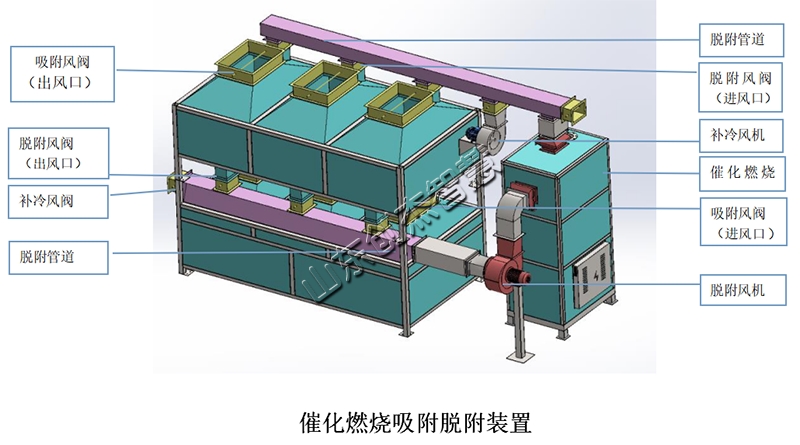 有機(jī)廢氣由排風(fēng)管引入干式過(guò)濾凈化器,出去有機(jī)廢氣中的漆霧、粉塵和水的有機(jī)廢氣吸附凈化設(shè)備,干凈的尾氣由風(fēng)機(jī)出口煙囪排放。用熱空氣對(duì)吸附飽和后的凈化設(shè)備進(jìn)行脫附再生,脫附下來(lái)的高濃度有機(jī)廢氣經(jīng)換熱器進(jìn)入催化床進(jìn)行催化燃燒,生成CO2和H2O,并放出熱量。此熱空氣與脫附下來(lái)的廢氣進(jìn)行換熱,使此氣體達(dá)到催化氧化的起燃溫度。