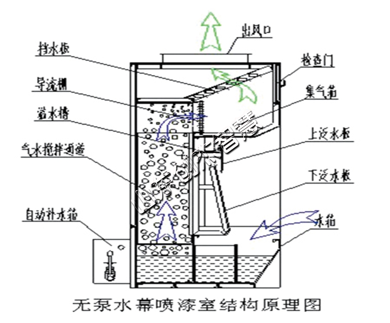 無泵水幕噴漆房采用空氣提水形成循環水幕。含有漆霧的空氣在與水幕撞擊后,穿過水簾進入氣水通道,與通道里的水產生強烈的混合,當進入集氣箱后,流速突然降低,氣水分離,空氣通過擋水板后,被排風機排放到大氣中;而被分離的水在集氣箱匯集后流入溢水槽,水從溢水槽溢流到泛水板上形成水幕,流回水箱。循環水中添加特殊的絮凝劑,改變漆霧的粘附狀況,使漆霧結成渣塊,便于清理。