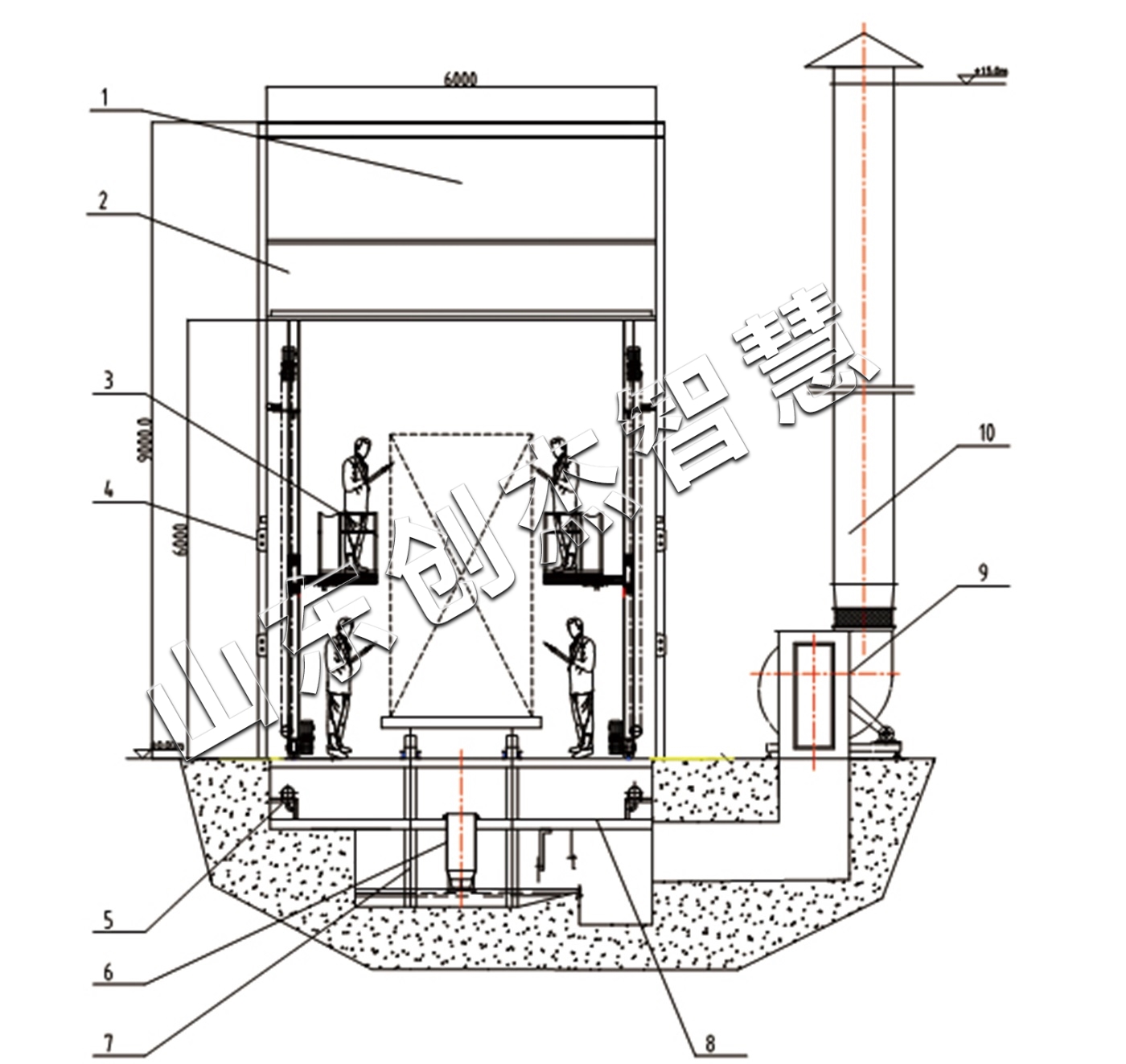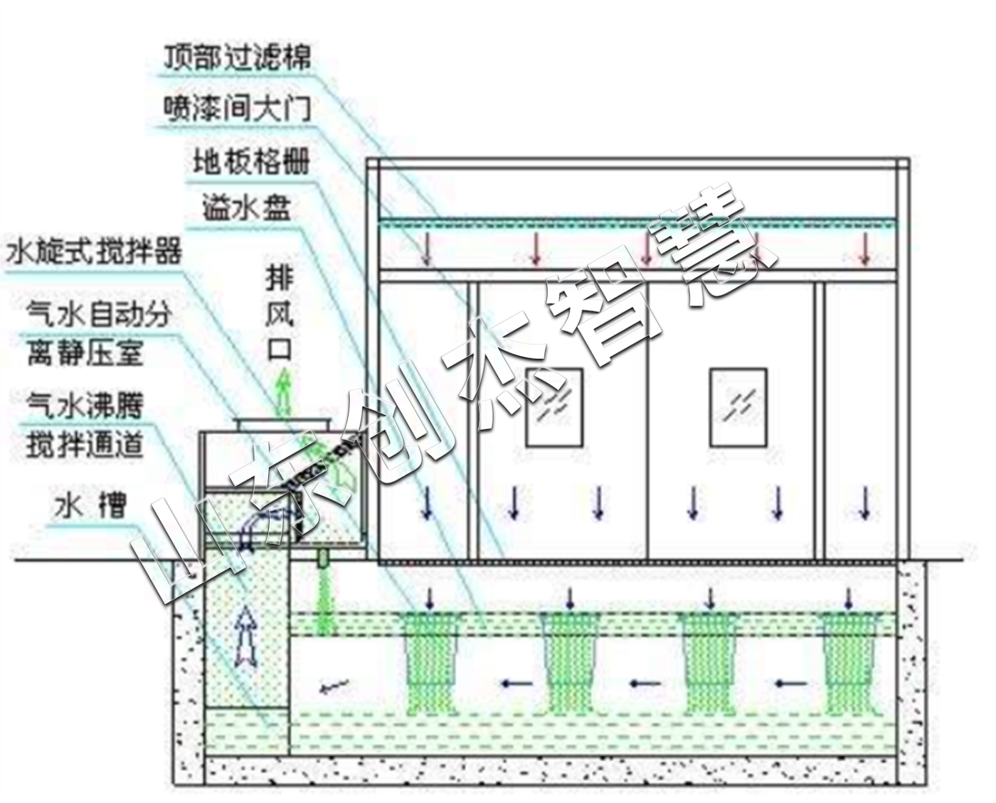 水旋式噴漆房一般是采用上送風下排風方式,房頂設置過濾棉,進行空氣的初級過濾,保護室內作業環境,漆霧捕集裝置在噴漆房的下方。在由上而下的風力帶動下,使漆霧與水在噴漆房下部充分混合,從而達到噴漆廢氣凈化的目的。 ??